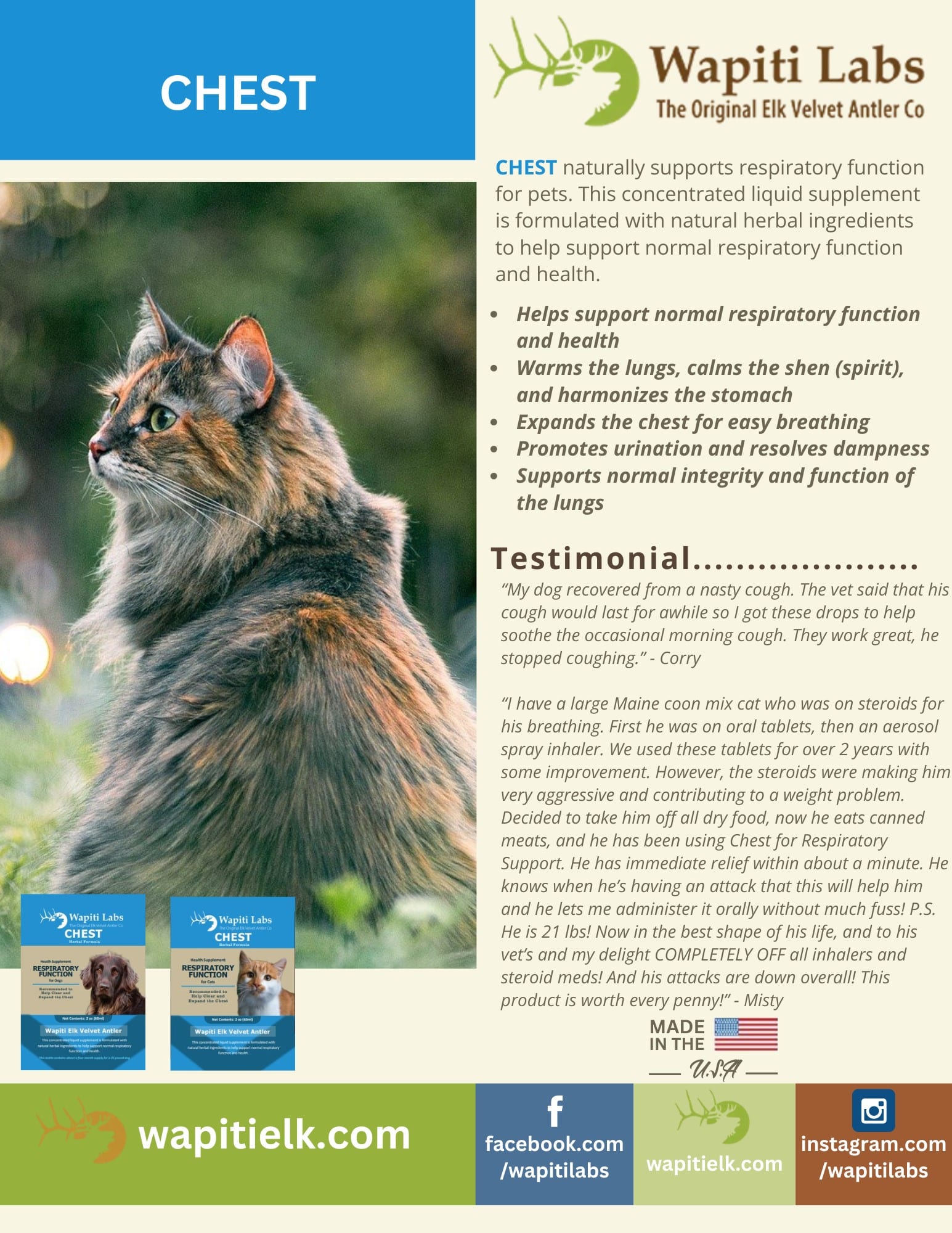 Support your dog’s respiratory health naturally with Wapiti Labs Chest—a carefully crafted herbal formula designed to promote clear airways, healthy lung function, and easy breathing. This blend of traditional herbs works synergistically to help open and expand the chest, reduce phlegm buildup, and support overall respiratory comfort.