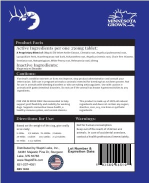 Wapiti Labs natural blend of Elk Velvet Antler (EVA) and traditional herbs is formulated to support positive joint function as well as help maintain joint mobility for dogs.